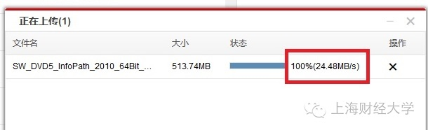 我校的“文档云”系统是我校的私有云存储系统,所有资料均校内存储,传输链路经过加密后承载于校园网之上,上传下载较于公有云网盘有极大的优势,速度不输于使用U盘和移动硬盘,且方便性优于前两者,且看下图的上传速度